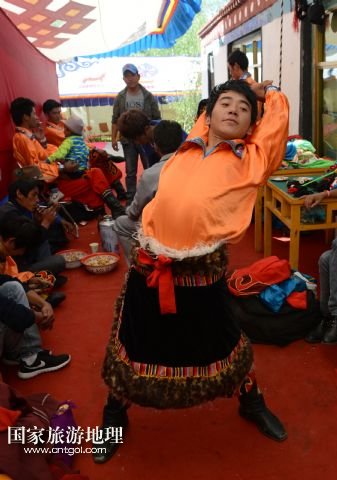 8月6日,在西藏堆龍德慶縣乃瓊鎮(zhèn)甲熱村舉行的雪頓節(jié)曬佛慶典上,甲熱村覺木隆藏戲團(tuán)的演員們?nèi)雸?chǎng)表演。