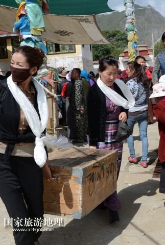 國(guó)家旅游地理 西藏拉薩8月9日訊 8月6日,在西藏堆龍德慶縣乃瓊鎮(zhèn)甲熱村,覺木隆藏戲團(tuán)團(tuán)長(zhǎng)瓊達(dá)(前右)在演出后和團(tuán)員一起搬運(yùn)道具。藏戲是藏族人民喜聞樂見的藝術(shù)形式,而發(fā)源于甲熱村(舊稱覺木?。┑挠X木隆藏戲在藏戲各流派中流傳最廣。