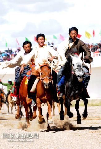 國家旅游地理 西藏那曲8月10日訊 8月10日,藏族牧民在進行跑馬比賽。當日,一年一度的藏北“恰青”賽馬藝術旅游節(jié)開幕,牧民們相聚那曲賽馬場,載歌載舞慶祝豐收。 /新華社記者唐召明攝