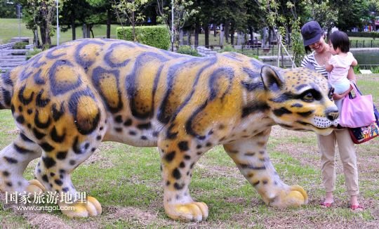 9月17日,人們?cè)谂_(tái)北市青年公園欣賞云豹雕塑。