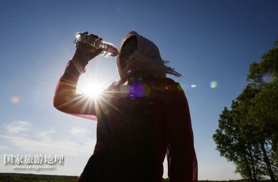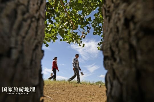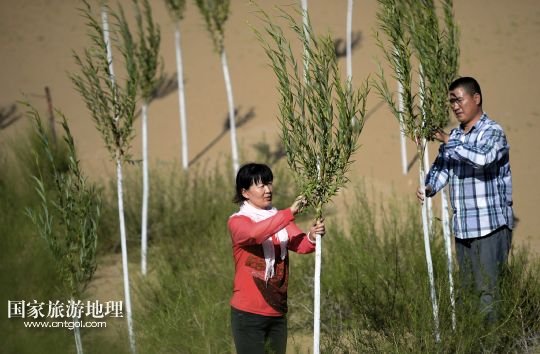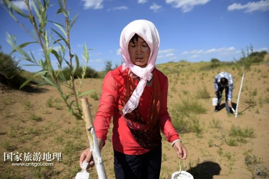 國(guó)家旅游地理 寧夏銀川10月11日訊 圖為顧蕓香(8月14日攝)  14年來,寧夏靈武農(nóng)民顧蕓香的心,不知隨著沙漠里的樹“生生死死”了多少回。