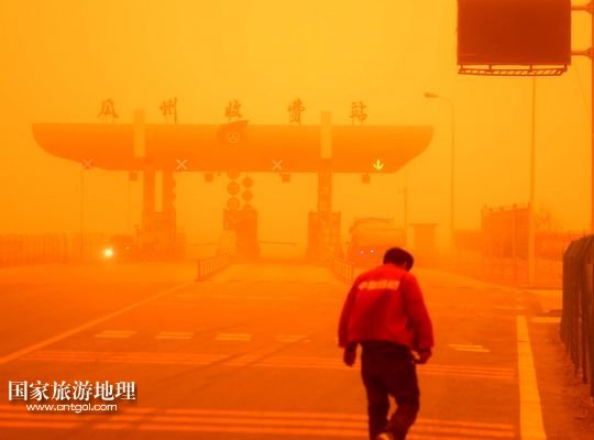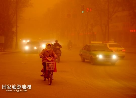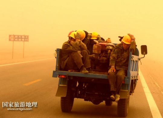 國家旅游地理 甘肅酒泉4月23日訊 4月23日,一輛拉載公路施工人員的三輪車在沙塵暴中行駛在酒泉市瓜州縣城郊的公路上。當(dāng)日,甘肅省酒泉市的敦煌市、瓜州縣等地遭受特強(qiáng)沙塵暴襲擊,最小能見度不足20米。當(dāng)日下午,酒泉市氣象臺發(fā)布沙塵暴紅色預(yù)警信號。 /新華社記者 聶建江 攝