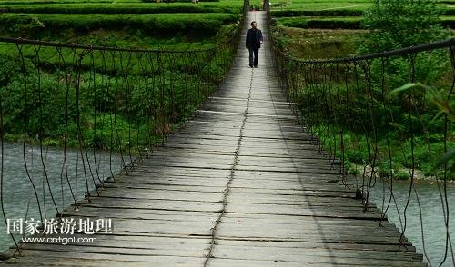 國(guó)家旅游地理 湖北恩施4月28日訊 4月27日,村民走在麻柳溪村的吊橋上。溪水潺潺,繁花匝地,翠林擁抱茶園,薄霧掩映木樓。悅耳的鳥(niǎo)鳴,裊裊的炊煙,讓人仿佛置身世外桃源……這就是湖北省恩施土家族苗族自治州咸豐縣黃金洞鄉(xiāng)麻柳溪村。