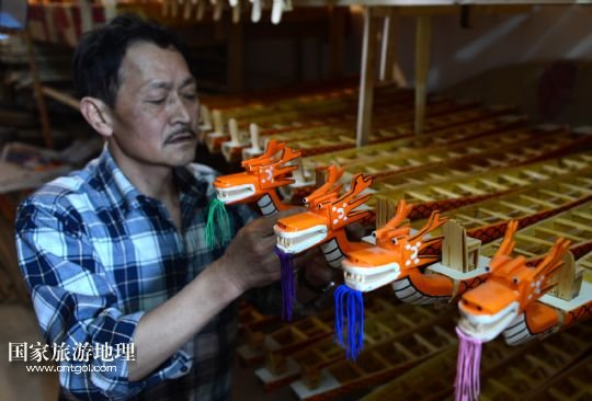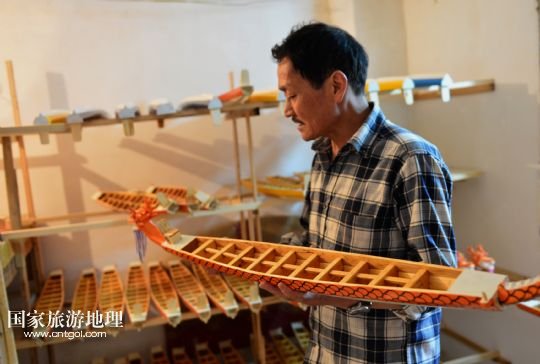國(guó)家旅游地理 湖北宜昌5月15人訊 5月15日,手工藝人鄭祥龍?jiān)跒槲⑿妄堉凵淆堫^。端午節(jié)臨近,屈原故里湖北省秭歸縣歸州鎮(zhèn)手工藝人鄭祥龍精心制作一條條微型木制龍舟,準(zhǔn)備在端午文化節(jié)期間向中外游客進(jìn)行展示。