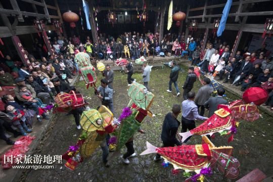 國(guó)家旅游地理 浙江麗水11月10日訊 11月8日,浙江景寧畬族自治縣九龍鄉(xiāng)嶺里村的村民在徐氏宗祠內(nèi)表演傳統(tǒng)非遺節(jié)目——魚燈。當(dāng)日,浙江省麗水市景寧畬族自治縣“中國(guó)畬鄉(xiāng)魚燈藝術(shù)村展示非遺之美·慶祝豐年活動(dòng)”在九龍鄉(xiāng)嶺里村舉行。嶺里村自古有在節(jié)日里舞魚燈的習(xí)俗,寄托著人們期望生活吉祥如意、連年有余的美好愿望。 新華社發(fā)(李肅人 攝)