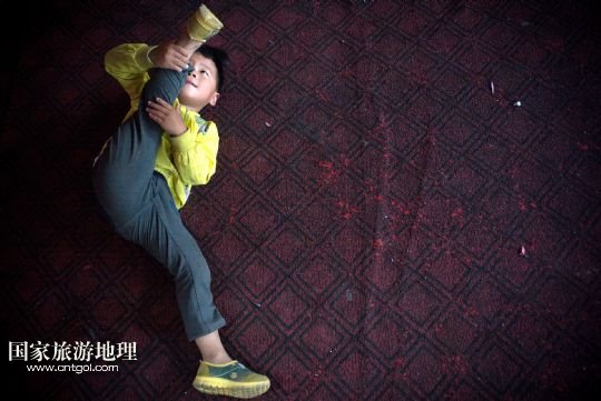 剛來到這里的孩子都要從最基本的壓腿、翻跟頭等基礎(chǔ)訓(xùn)練學(xué)起,練好基本功后大部分孩子會(huì)離開學(xué)校,過幾年長(zhǎng)大一些再回來學(xué)些雜技表演動(dòng)作,學(xué)得好就可以上臺(tái)參與表演。