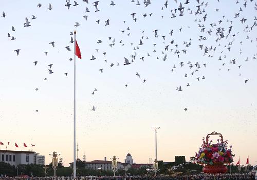 10月1日,天安門廣場(chǎng)舉行升國(guó)旗儀式。當(dāng)日清晨,來(lái)自全國(guó)各地的各族群眾在北京天安門廣場(chǎng)觀看升國(guó)旗儀式,慶祝中華人民共和國(guó)成立66周年。新華社記者 邢廣利 攝