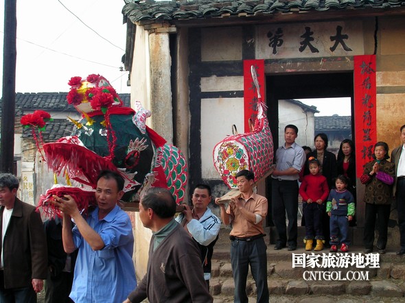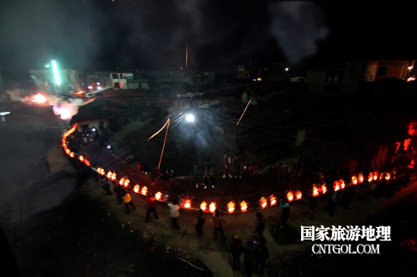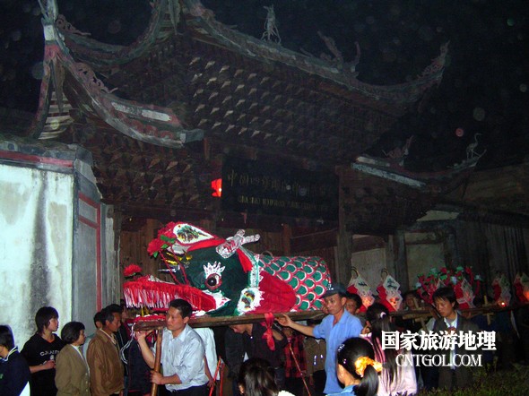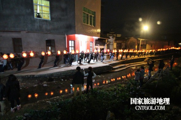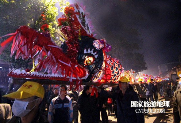2月18日入夜,春雨霏霏。在光裕堂祖祠祭龍頭畢,鄒姓村民紛紛肩抬慶燈到祖祠接成220多米長的“龍”身。三聲銃響,游龍時而在村間慢悠游弋,時而在村道滯拔狂走,火紅的燭光伴著霏霏春雨,讓慶燈“龍”絢麗多姿,展示了“紙包火”的奇跡。 游“龍”所經(jīng)之處,鞭炮和禮花聲不絕于耳,祈求五谷豐登、吉祥如意。街巷人山人海,熱鬧非凡,一派花燈游龍慶豐收狂歡鬧元宵盛況。 吸引了海內(nèi)外游客及四鄰八鄉(xiāng)的萬余群眾紛紛前往觀看。